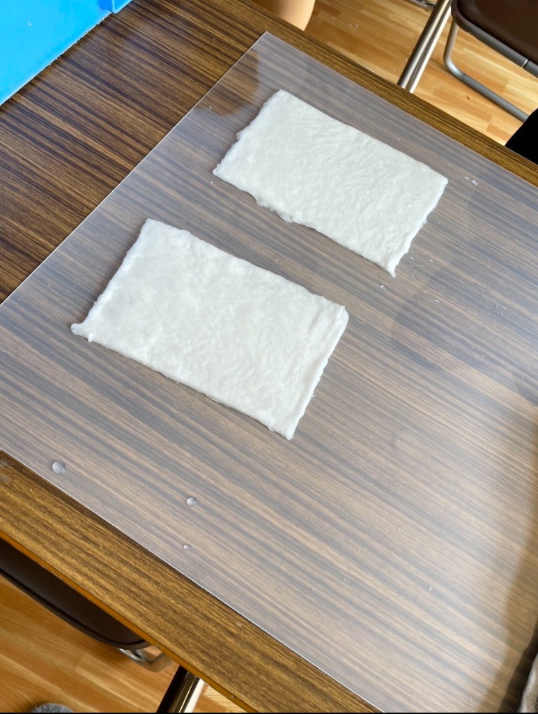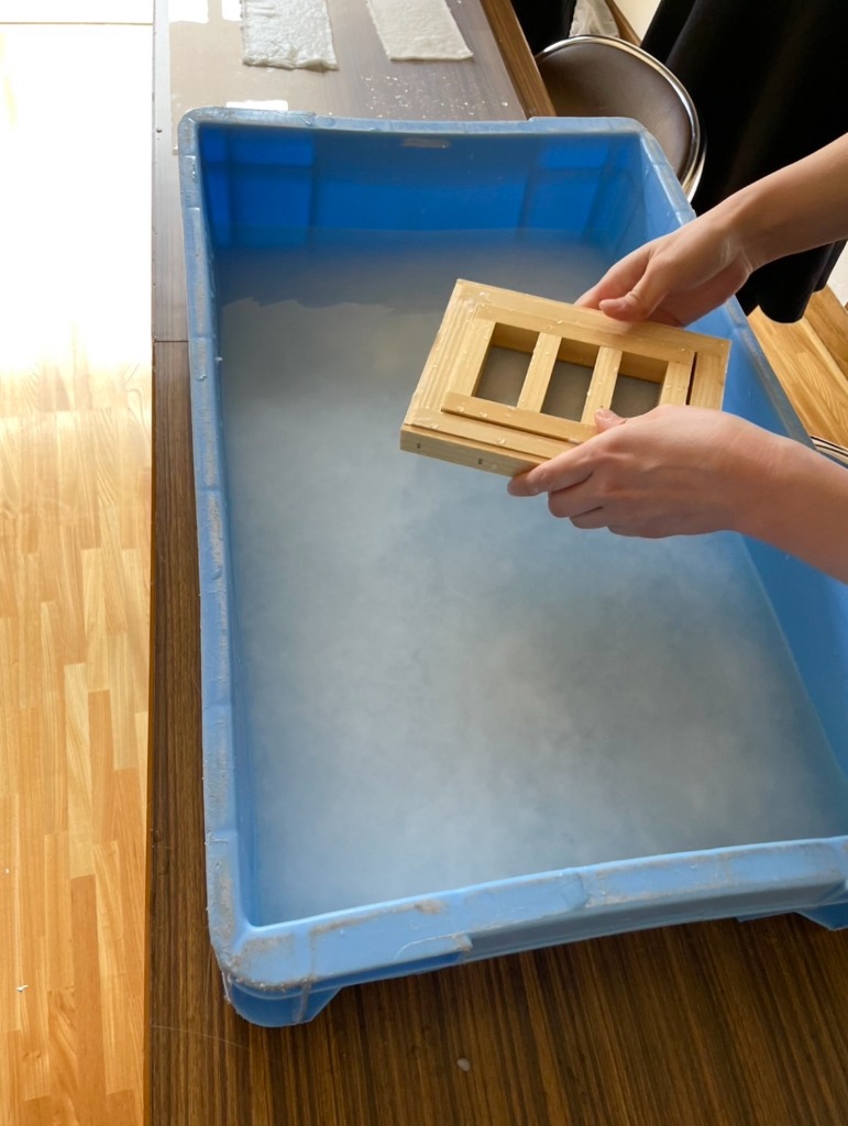 漉き枠を使用して圧搾・脱水・乾燥の工程があり、綺麗な仕上がりになるまでは少しコツがいりますが、